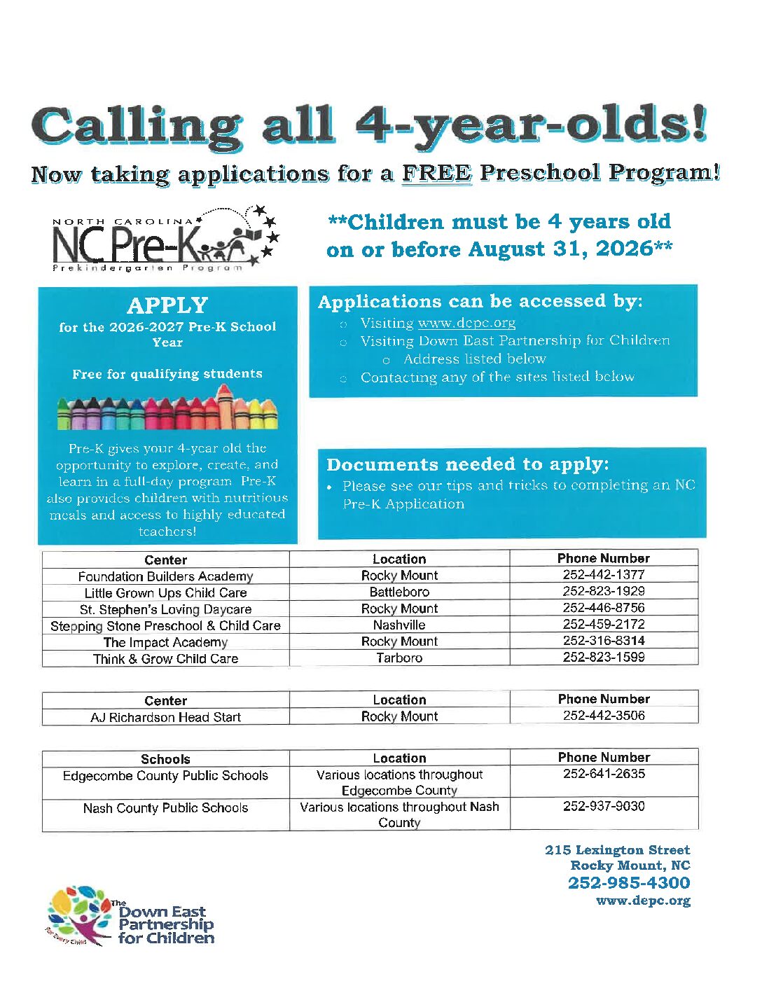 THE NC PRE-K ADVISORY COMMITTEE – The NC Pre-K Program requires every county (or region) that chooses to participate to establish and maintain an Advisory Committee. This committee is represented in part by local school boards and systems, the local Smart Start partnership, licensed child care providers, Head Start, Department of Social Service, parent(s) of preschool-age children, and the child care resource and referral agency. In Nash/Edgecombe Counties, the NC Pre-K Advisory Committee meets at a minimum of four times a year.